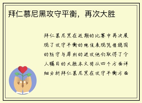 拜仁慕尼黑在近期的比赛中再次展现了攻守平衡的绝佳表现,凭借稳固的防守与犀利的进攻,他们取得了令人瞩目的大胜。本文将从四个方面详细分析拜仁慕尼黑在攻守平衡方面的成功之道,包括战术安排、球员协作、个体表现...